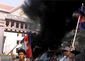 昨天傍晚,上千名柬埔寨學(xué)生和民眾在金邊泰駐柬大使館外示威,并逐漸釀成沖擊、打砸、焚燒使館的嚴(yán)重事件。同時(shí),泰國(guó)設(shè)在金邊的泰航辦事處、西那瓦電信公司辦事處、泰京銀行分行、三家泰資酒店及一些泰餐館也遭暴民打砸焚燒。據(jù)報(bào)道,此事起因于十幾天前一位泰國(guó)女明星關(guān)于柬著名古跡吳哥窟應(yīng)屬泰國(guó)的言論。柬媒體對(duì)此進(jìn)行報(bào)道后,激起柬民憤。該女明星已于前天在曼谷聲明否認(rèn)曾發(fā)表上述言論。泰國(guó)總理他信昨晚得知此事,立即趕往總理府召開(kāi)國(guó)家安全緊急會(huì)議。在會(huì)后舉行的記者會(huì)上,他信宣布泰國(guó)與柬埔寨外交關(guān)系由大使級(jí)降為代辦級(jí),召回駐柬大使,撤回泰僑,要求柬埔寨政府嚴(yán)懲兇手和賠償,直到泰方滿(mǎn)意后再談判恢復(fù)雙邊關(guān)系。