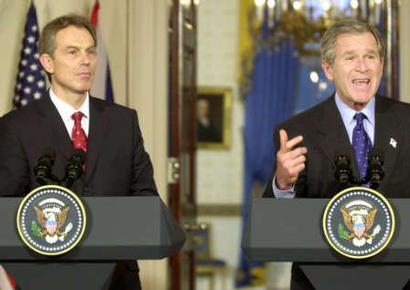 布什在會談結(jié)束后與布萊爾聯(lián)合舉行的記者招待會上說,國務(wù)卿鮑威爾下周將向聯(lián)合國安理會出示證據(jù),證明“薩達(dá)姆正在愚弄世界”。他說,伊拉克問題“將在幾個(gè)星期,而不是幾個(gè)月內(nèi)得到解決”,美國堅(jiān)決反對任何將伊拉克問題拖延幾個(gè)月后再解決的企圖。