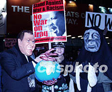 當(dāng)?shù)貢r(shí)間二月五日,在鮑威爾向聯(lián)合國(guó)提交伊拉克擁有大規(guī)模殺傷性武器新證據(jù)的同時(shí),數(shù)百人在紐約時(shí)代廣場(chǎng)集會(huì),反對(duì)美國(guó)對(duì)伊拉克開戰(zhàn)。傍晚時(shí),越來越多下班的紐約人自動(dòng)加入,集會(huì)遂演變?yōu)檠刂氖中羞M(jìn)的反戰(zhàn)示威游行。圖為帶著布什面具的示威者。作者:龔文謨