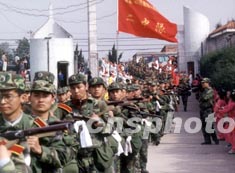 解放軍軍事經(jīng)濟學院的學員隊伍新春展開行軍演練,途中在湖北省谷城縣受到百姓官員夾道歡迎。作者:王偉兵
