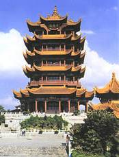 黃鶴樓原址湖北武昌蛇山黃鶴磯頭,始建于三國時(shí)期吳黃武二年(公元223年),傳說是為了軍事目的而建,亦有傳說指其原為辛氏開設(shè)的酒店。1957年建長江大橋武昌引橋時(shí),占用黃鶴樓舊址,如今重建的黃鶴樓在距舊址約1千米左右的蛇山峰嶺上。其樓共五層,高50.4米,攢尖頂,層層飛檐,四望如一。在主樓周圍還建有勝象寶塔、碑廊、山門等建筑。整個(gè)建筑具有獨(dú)特的民族風(fēng)格。