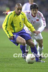 巴西隊排出三五二陣容,依靠“三R”組成銳利的鐵三角力圖控制中場,中國隊則擺出四五一陣容,采用中場密集攔截的戰(zhàn)術(shù)布置,瓦解巴西隊的進(jìn)攻。開場后十五分鐘內(nèi),雙方互相試探,攻勢平平,只是巴西隊在十二分鐘時,右路連續(xù)獲得兩個角球機(jī)會,才掀起一絲波瀾。三十分鐘時,巴西隊在進(jìn)攻左前方獲得直接任意球機(jī)會,里瓦爾多一記漂亮的弧線球繞過中國隊人墻,直奔球門左側(cè),幸被中國隊門將劉云飛撲出。
