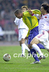 上半場中巴兩隊均排出最強(qiáng)陣容,特別是巴西“五虎上將”羅納爾多、里瓦爾多、羅納爾迪尼奧、卡洛斯和卡福的悉數(shù)登場,更是樂壞全場球迷。中國隊則以李霄鵬、肇俊哲、鄭智、李瑋鋒、李鐵、孫繼海、楊璞、祁宏、魏新、李毅、劉云飛組成首發(fā)陣容迎戰(zhàn)。