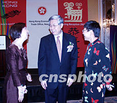 香港特區(qū)駐紐約經(jīng)濟(jì)貿(mào)易辦事處二月十二日晚在曼哈頓舉行羊年新春酒會(huì)。圖為中國(guó)常駐聯(lián)合國(guó)代表王英凡(中)、香港駐美國(guó)總經(jīng)濟(jì)貿(mào)易專員韋玉儀(左)、紐約駐香港經(jīng)貿(mào)辦事處主任何寶珠在酒會(huì)上互致問(wèn)候。作者:龔文謨