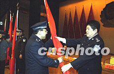 十四日,北京警方舉行治安系統(tǒng)“兩會(huì)”安全保衛(wèi)動(dòng)員大會(huì),公安局長(zhǎng)馬振川(右)為“兩會(huì)”治安保衛(wèi)突擊隊(duì)授旗。作者:任海霞