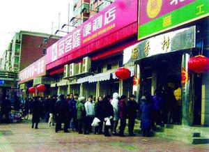 中午1點(diǎn)10分,記者在勁松橋西北角的稻香村分店門口看到,排隊(duì)的顧客有180多人,隊(duì)伍一直向西遮擋了該店隔壁兩家店鋪的街面,蜿蜒到了一棟宿舍樓前。排在最后的顧客已經(jīng)開(kāi)始聊天解悶。商店門口的柱子上則貼著“每人限購(gòu)4斤”的告示,兩名男營(yíng)業(yè)員站在柜臺(tái)外維持秩序,正在買元宵的顧客說(shuō),自己9點(diǎn)多就排上了,都快沒(méi)信心了才輪到。