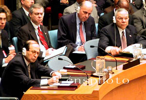 真所謂“不是冤家不聚頭”,伊拉克常駐聯(lián)合國(guó)代表穆罕默德·杜里列席會(huì)議,而且就落座于美國(guó)國(guó)務(wù)卿鮑威爾身旁。鮑威爾不時(shí)地瞟著杜里,看他聽(tīng)別人發(fā)言時(shí)忙些什么。發(fā)言中,鮑威爾稱伊拉克領(lǐng)導(dǎo)人是“瘋子”,始終玩弄各種花招,欺騙世界。他還強(qiáng)硬地要求伊拉克“必須服從”,解除武裝。杜里始終鎮(zhèn)靜地做著筆記。發(fā)言中,他很低調(diào)地表白:伊拉克已經(jīng)完全敞開(kāi)了武器核查的大門,目的是向全世界證明,沒(méi)有大規(guī)模殺傷性武器。他諷刺說(shuō):“這出乎有些人的意料,他們對(duì)我們前所未有的合作感到吃驚!