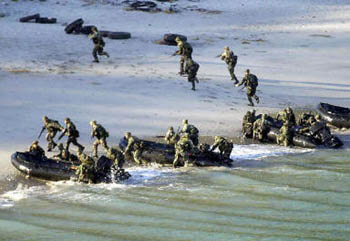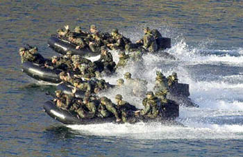 為鏟除阿布沙耶夫恐怖組織,美海軍陸戰(zhàn)隊(duì)18日在馬尼拉以南島嶼與菲律賓軍隊(duì)舉行聯(lián)合軍事演習(xí)。圖為:美海軍陸戰(zhàn)隊(duì)西棲搶灘登陸。