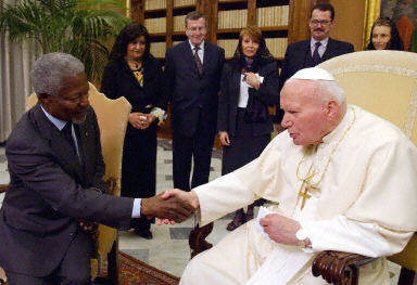 抵達(dá)羅馬參加聯(lián)合國發(fā)展署有關(guān)會議的聯(lián)合國秘書長安南與羅馬天主教皇約翰保羅二世舉行了長達(dá)30分鐘的會談。