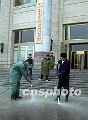 工作人員二十三日在北京人民大會(huì)堂門(mén)外清理地面灰塵,迎接將于三月初召開(kāi)的第十屆全國(guó)人民代表大會(huì)與全國(guó)政協(xié)十屆會(huì)議。作者:毛建軍