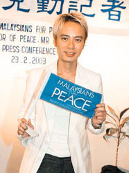 中新網(wǎng)2月25日電 香港歌手李克勤日前被邀往馬來(lái)西亞吉隆坡?lián)萎?dāng)?shù)嘏e行的“反戰(zhàn)音樂(lè)會(huì)”嘉賓,他是唯一一個(gè)來(lái)自香港的歌手,獲得當(dāng)?shù)赜嘘P(guān)部門(mén)頒發(fā)的“和平大使”錦旗,克勤笑言自己像是香港小姐得獎(jiǎng)。