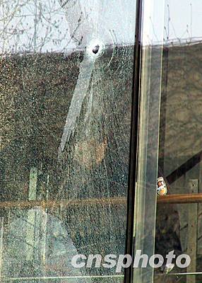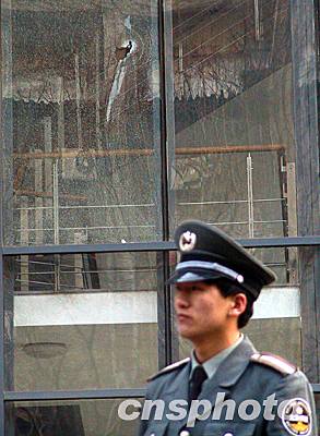 北京大學農(nóng)園餐廳二月二十五日發(fā)生自制黑火藥爆炸事故。圖為保安在餐廳被爆裂的玻璃前執(zhí)勤。作者:武仲林