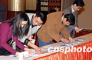 “兩會”新聞中心的工作人員正在為參加“兩會”報道的香港記者辦理采訪證件。估計參加今年全國“兩會”報道的海內外記者將近三千人。作者:盛佳鵬