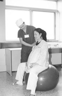 她感覺最有意思的鎮(zhèn)痛措施是:在兩次陣痛之間騎坐在分娩球椅上。分娩球是一個直徑1米的彩色充氣橡膠球,固定在有扶手的坐椅上,在規(guī)律宮縮的間歇騎坐上去,可以達(dá)到放松盆底肌肉的目的。她坐了一會兒,果然感到柔軟舒適,疼痛減輕!