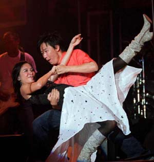 李心潔當(dāng)晚和好友阿牛的“親密”演出掀起全場高潮,為了阿牛,李心潔又是伴舞又是陪唱,更破例在臺上演唱廣東歌《失戀好煩》,雖然只是和音,但她和阿牛的“阿哥哥”舞就叫大家忍不住HIGH起來,最后心潔更把右腳踩在阿牛的左大腿上,讓阿牛驚呼∶“李心潔,終于踩對地方了!大家知不知道她彩排時(shí)常踩錯(cuò)地方!”臺下一陣爆笑!