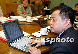 全國人大代表、浙江正泰集團(tuán)公司董事長南存輝,七日在浙江代表團(tuán)審議會上使用電腦修改發(fā)言稿。在今年的人代會上,很多代表都是攜帶電腦參會。作者:毛建軍