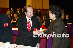 出席全國(guó)政協(xié)十屆一次會(huì)議的港澳委員七日在北京政協(xié)禮堂舉行聯(lián)組會(huì),中共中央統(tǒng)戰(zhàn)部部長(zhǎng)劉延?xùn)|向出席會(huì)議的何鴻燊表示問(wèn)候。作者:毛建軍
