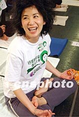 香港藝員吳君如,在三月八日香港舉行的“百人紓壓瑜伽日”活動上苦練瑜伽功。錢興強 攝