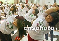 “白蘭氏”與香港各界婦女聯(lián)合協(xié)會,三月八日在香港舉行“百人紓壓瑜伽日”活動。圖為眾多女士練瑜伽功。錢興強 攝