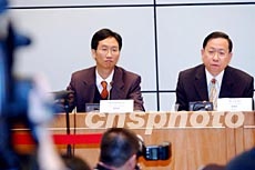 香港入境事務(wù)處處長(zhǎng)黎棟國(guó)(右)與財(cái)經(jīng)事務(wù)及庫(kù)務(wù)局首席助理秘書(shū)長(zhǎng)劉應(yīng)彬,3月11日在記者會(huì)上,就資本投資者入境計(jì)劃及輸入內(nèi)地人才計(jì)劃答記者問(wèn)。洪少葵 攝