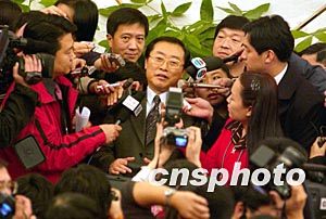 中國勞動和社會保障部部長張左己十二日在十屆全國人大舉行的中外記者招待會結(jié)束后,被眾多提問記者包圍。作者:張煒