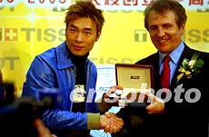瑞士天梭表TISSOT全球總裁弗朗索瓦·添寶(右)十四日在上海新天地向香港明星許志安(左)贈送名表,由此展開其世界巡回展中國大陸地區(qū)第一站。作者:劉殊瑾