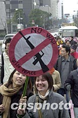 東京市民十五日在市中心的一處公園內(nèi)集會,并在繁華的銀座商業(yè)街游行,反對美國準備對伊拉克發(fā)動戰(zhàn)爭。作者:陶光雄