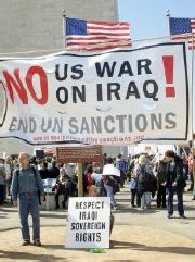 在主戰(zhàn)陣營的領(lǐng)導(dǎo)者美國國內(nèi),來自100多個(gè)城市的數(shù)以萬計(jì)示威者匯聚到首都華盛頓,以主辦者所形容的“人!睉(zhàn)術(shù),盡最后努力游說布什總統(tǒng)聽聽民間反戰(zhàn)的聲音。示威者在華盛頓紀(jì)念碑集會,其后匯合游行隊(duì)伍,聲勢浩大地游行往白宮和司法部。一名大學(xué)生呼吁:“布什總統(tǒng),聽聽今天在你面前人民的聲音吧,美國人說“不要向伊拉克開戰(zhàn)””。