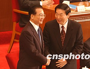 朱镕基祝賀溫家寶出任中國(guó)新一屆政府總理。賈國(guó)榮