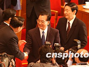 溫家寶和朱鎔基一同接受代表祝賀。作者:鄭萍萍