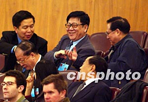 三月十七日,十屆全國人大一次會(huì)議舉行第七次全體會(huì)議,正在會(huì)場的新任部長們互致祝賀。作者:張煒