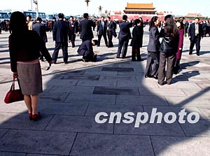 三月十七日北京天安門廣場春光明媚,人大代表們在參加全國人大十屆一次會議第七次全體會議投票前紛紛拍照留影。作者:賈國榮