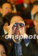 十七日下午,一名出席十屆全國人大一次會議第七次全體會議的香港代表用望遠(yuǎn)鏡觀看主席臺,關(guān)注新一屆政府組成人員。作者:毛建軍