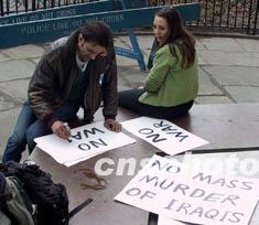 三月十七日在聯(lián)合國安理會(huì)為避免戰(zhàn)爭竭盡所能之時(shí),守候在聯(lián)合國大樓外的反戰(zhàn)者書寫反戰(zhàn)標(biāo)語,為阻止戰(zhàn)爭做最后努力。作者:趙海燕