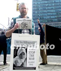 當(dāng)?shù)貢r(shí)間三月十七日上午,聯(lián)合國內(nèi)伊拉克問題上的外交斗爭正式結(jié)束。美、英、西宣布,放棄在安理會(huì)上對伊拉克最后通牒議案進(jìn)行表決的努力。在聯(lián)合國總部門前,一名反戰(zhàn)者身掛伊拉克殘疾少女畫像的表語牌,上書:“為抓住薩達(dá)姆,你想殺死她嗎”?作者:陳