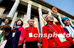 十屆全國人大一次會議十八日在北京閉幕,少數(shù)民族代表談笑著離開會場。作者:鄭萍萍