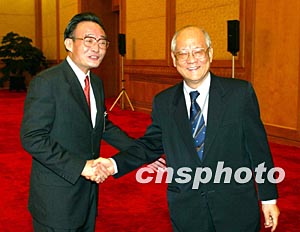 吳邦國委員長十八日下午在北京人民大會堂會見出席十屆人大一次會議的港澳代表。圖為吳邦國與香港代表吳康民握手。作者:毛建軍