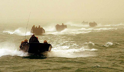 驚天動地的大爆炸之后,英國皇家海軍陸戰(zhàn)隊第3突擊旅和美海軍陸戰(zhàn)隊遠征小隊的官兵們分乘武裝直升機和汽墊船直向法奧半島的“紅灘”撲去。由于“紅灘”是“肖特-阿拉伯水道”與海灣的戰(zhàn)略接點,所以美英陸戰(zhàn)隊都覺得惡戰(zhàn)難免。然而,讓他們大感意外的是,當全幅武裝的美英軍人如狼似虎地撲向灘頭陣地時,發(fā)現那里根本沒有伊拉克軍人,整個灘頭安靜得讓人不可思議,唯一的活動的目標是兩條沖著他們汪汪亂叫的狗,似乎就它們對不速之客的入侵有意見!美國的海豹特種戰(zhàn)部隊為謹慎起見,還是清除了灘頭,把兩只汪汪亂叫的狗趕跑,然后迎接乘坐“支努干”重型運輸直升機和“海王”直升機降落的英軍大部隊。