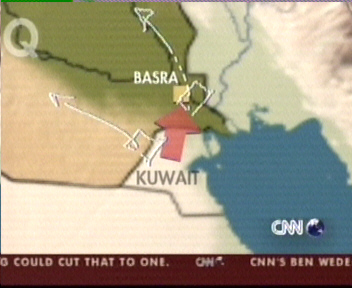 來不及多理他們,步3師的10000余輛坦克,裝甲車,卡車向伊拉克一方涌去。由于萬輛軍用車輛絞起的陣陣黃沙,所以全體官兵們不得不用圍巾包住自己的臉,以免吃進黃沙。在滾滾沙塵中,唯一看得清的就是前車的一對后紅燈。陸3師在向伊陣地開前前,他們的師長告訴他們說,全師官兵將從8至12個地點同時向伊拉克境內推進,全體官兵應該帶夠能維持5至7天的口糧和飲用水,并且要求他們每天只能喝3升水。顯然,該師是想一口氣打到巴格達城下。