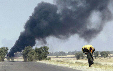 當(dāng)?shù)貢r間23日,伊拉克南部一石油管道被伊軍點燃,冒起滾滾濃煙。