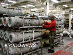 中新網(wǎng)北京3月24日電 正在波斯灣北部游弋的美軍“小鷹”號(hào)航空母艦于23日夜向隨行記者開放了其儲(chǔ)藏艦載飛機(jī)炸彈的彈藥庫(kù)。