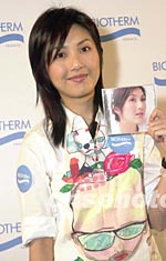 歌星楊千嬅3月26日在香港出席其代言化妝品牌BIOTHERM發(fā)布會(huì),展示為BIOTHERM收錄的主題曲“滿場(chǎng)飛”(粵語(yǔ)版)及“揚(yáng)眉”(國(guó)語(yǔ)版)的CD。鄧慶樂 攝