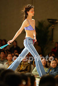 香港mudd jeans 2003年春夏時裝展二十六日在北京中國大飯店舉行,模特展示具有青春活力的休閑春夏時裝。作者:毛建軍
