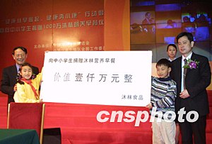 湖南沐林現(xiàn)代食品有限公司董事會(huì)主席伍躍時(shí)30日在北京人民大會(huì)堂通過中國光彩事業(yè)促進(jìn)會(huì)、中國少年先鋒隊(duì)全國工作委員會(huì)等單位,向中小學(xué)生捐贈(zèng)價(jià)值1000萬元人民幣的沐林谷物營養(yǎng)早餐,拉開“健康從早做起,健康奔小康”活動(dòng)序幕。作者:趙振清