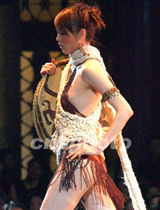 北京與香港合作的一家服飾公司年輕的設(shè)計總監(jiān)金光,新春展示他從中國古幣獲得靈感的鏤鑲時裝。作者:賈國榮