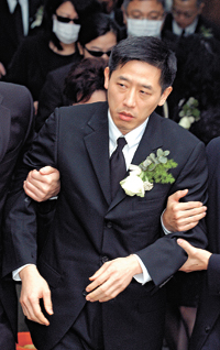“哥哥”的告別儀式十分短暫,約十分鐘左右便完成,所有親友均按習(xí)俗以碌柚葉水洗手,各領(lǐng)一封英雄利是及“哥哥”的紀(jì)念卡。只見“唐唐”悲慟得全身軟弱無力,不能走路,要由兩個(gè)人攙扶,不停望著“哥哥”的照片若有所思并念念有詞。圍觀的歌迷更向他說:“‘唐唐’,振作些!”