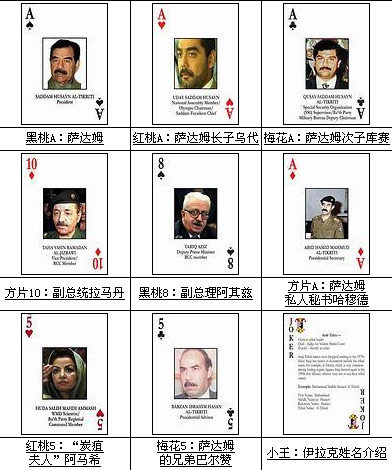 中新網(wǎng)4月12日電 據(jù)法新社報道,美國國務院當?shù)貢r間周五發(fā)出了撲克牌形式的伊拉克高官“通緝令”。媒體報道稱撲克牌共有55張,其中52人為伊拉克官員名單,另外的3張為伊拉克人姓名等相關問題介紹。這些高官按撲克牌的次序依次列出,其中薩達姆與他的兩個兒子分別被定為黑桃、梅花和紅心A。方片A為薩達姆私人秘書哈穆德。據(jù)悉,撲克牌“通緝令”已經(jīng)發(fā)到美軍官兵手中。