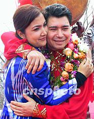 “二OO三阿迪力極限之旅”四月十六日在北京幕田峪長城舉行啟程儀式。“高空王子”阿迪力將進(jìn)行極限表演。圖為阿迪力在臨行前與妻子相擁。作者:盛佳鵬