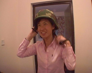 香港鳳凰衛(wèi)視女記者閭丘露薇在伊拉克試戴鋼盔