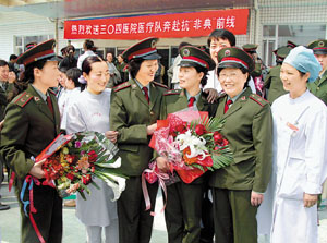 下午2時,304醫(yī)院舉行莊嚴(yán)而簡短的歡送儀式。記者看到,30名英姿勃勃的醫(yī)療隊員在全院戰(zhàn)友的鮮花和掌聲中登上汽車,院領(lǐng)導(dǎo)親自送他們赴定點醫(yī)院。記者還在海軍總醫(yī)院、307等醫(yī)院的政治部門看到了數(shù)千份請戰(zhàn)書、決心書。